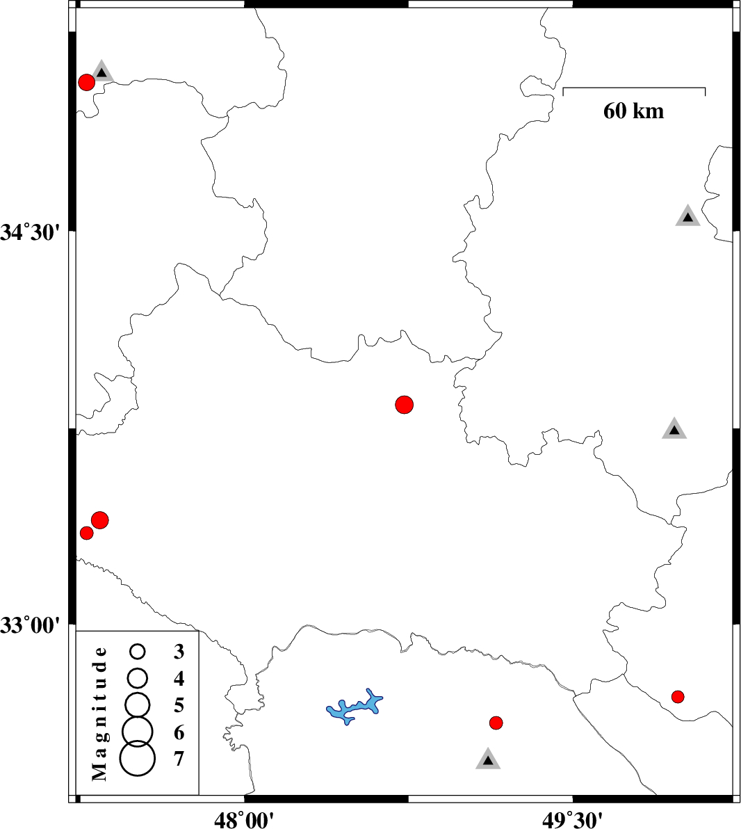| 2011/08/11 | 08:20:15.8 | 12:50:15.8 | 33.35 | 47.28 | 14 | ML:2.7 | Lorestan Province, 25 km North of Darreh Shahr | ||