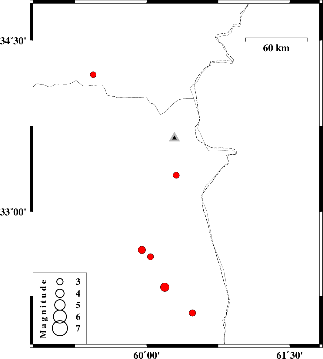 | 2011/08/02 | 18:08:34.2 | 22:38:34.2 | 32.33 | 60.19 | 46 | ML:4.1 | Khorasan(south) Province, 50 km South-East of Sarbisheh | ||