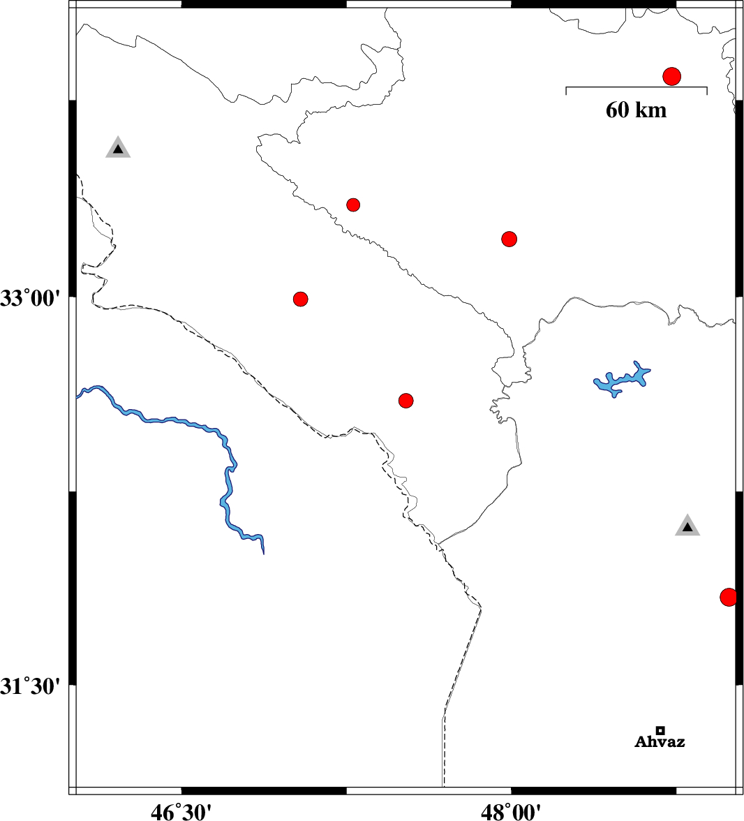| 2011/08/11 | 08:20:15.8 | 12:50:15.8 | 33.35 | 47.28 | 14 | ML:2.7 | Lorestan Province, 25 km North of Darreh Shahr | ||