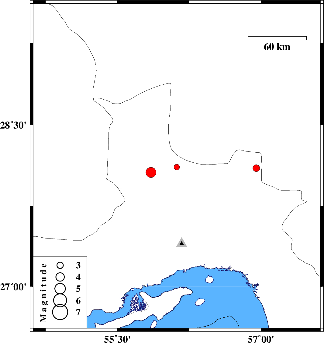| 2011/08/13 | 06:09:10.5 | 10:39:10.5 | 28.1 | 56.95 | 40 | ML:3.2 | Hormozgan Province, 75 km North-West of Kahnuj |