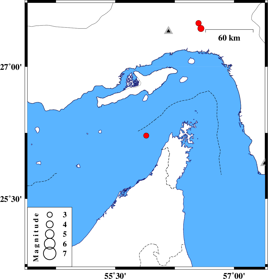 | 2011/08/20 | 22:40:29.1 | 03:10:29.1 | 26.22 | 55.89 | 33 | ML:3.1 | Persian Gulf, 90 km South-West of Qeshm | ||