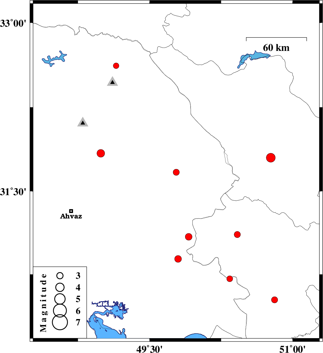 | 2011/08/04 | 01:54:37.6 | 06:24:37.6 | 31.09 | 49.91 | 14 | ML:3.2 | Khoozestan Province, 47 km South of Bagh Malek | ||