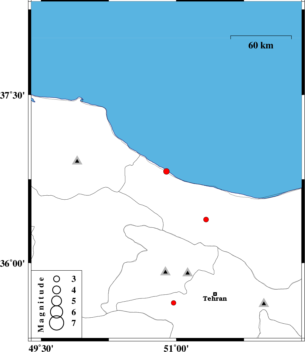 | 2011/08/11 | 12:28:35.6 | 16:58:35.6 | 36.39 | 51.33 | 14 | ML:2.6 | Mazandaran Province, 30 km South of Chalus | ||