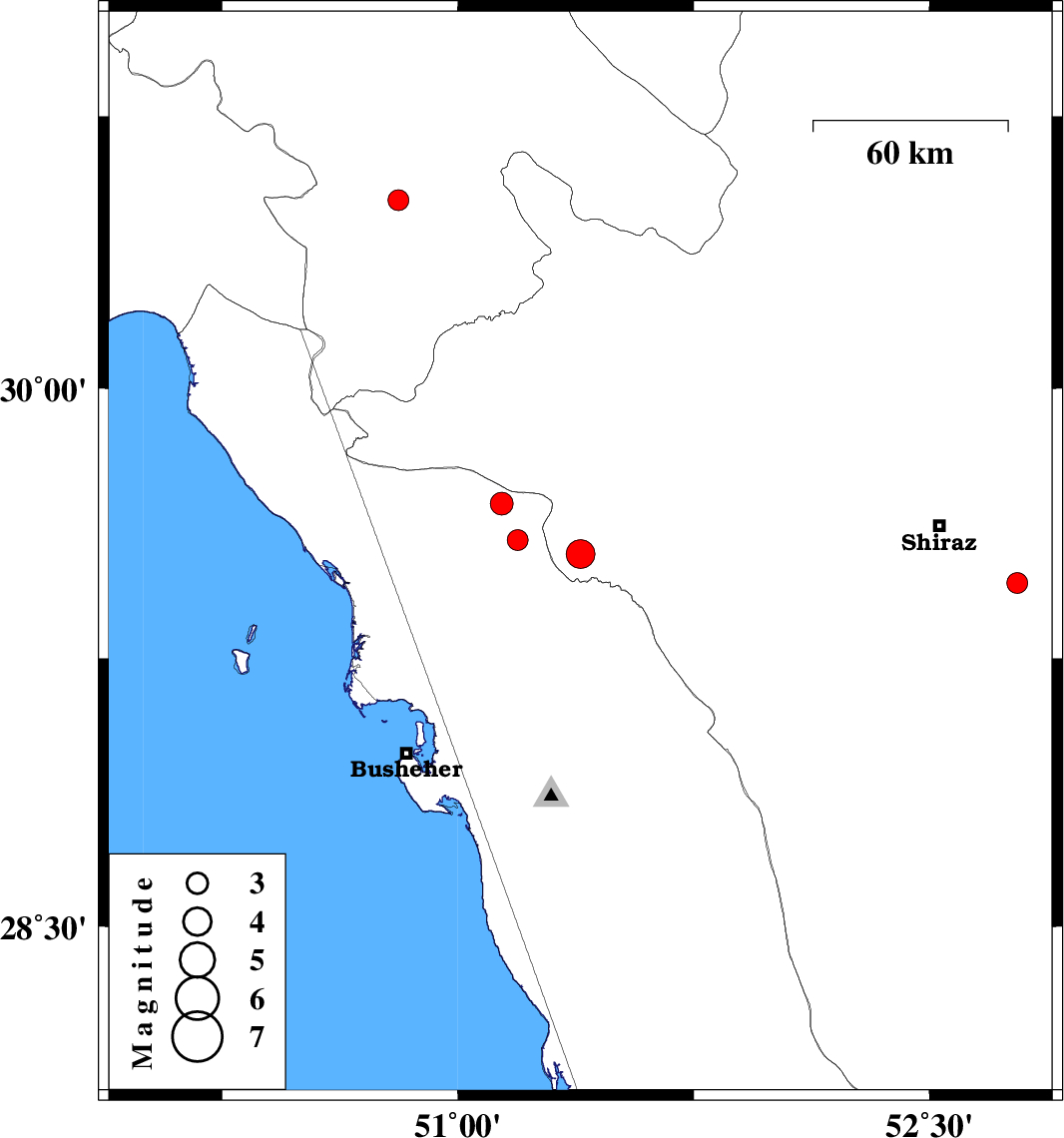 | 2011/08/27 | 08:30:56.6 | 13:00:56.6 | 29.68 | 51.14 | 31 | ML:3.2 | Bushehr Province, 47 km North of Borazjan | ||