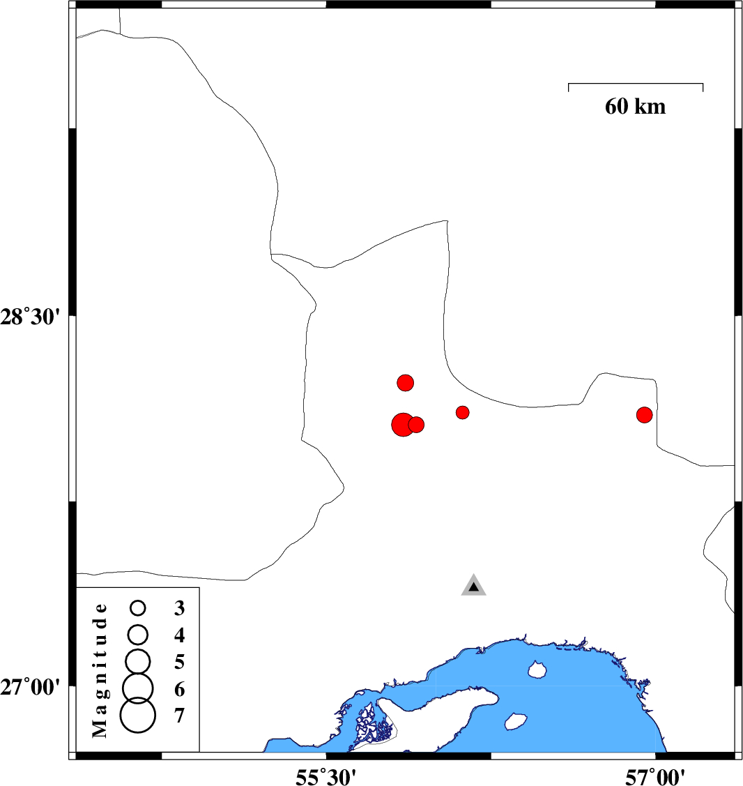 | 2011/08/27 | 15:02:06.2 | 19:32:06.2 | 28.23 | 55.86 | 6 | ML:3.4 | Hormozgan Province, 10 km Hajiabad | ||