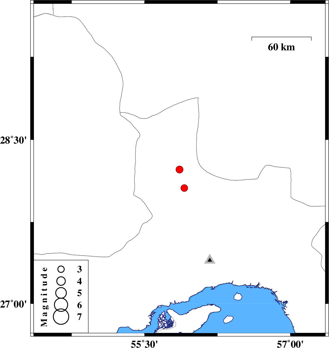 | 2011/08/27 | 15:02:06.2 | 19:32:06.2 | 28.23 | 55.86 | 6 | ML:3.4 | Hormozgan Province, 10 km Hajiabad | ||