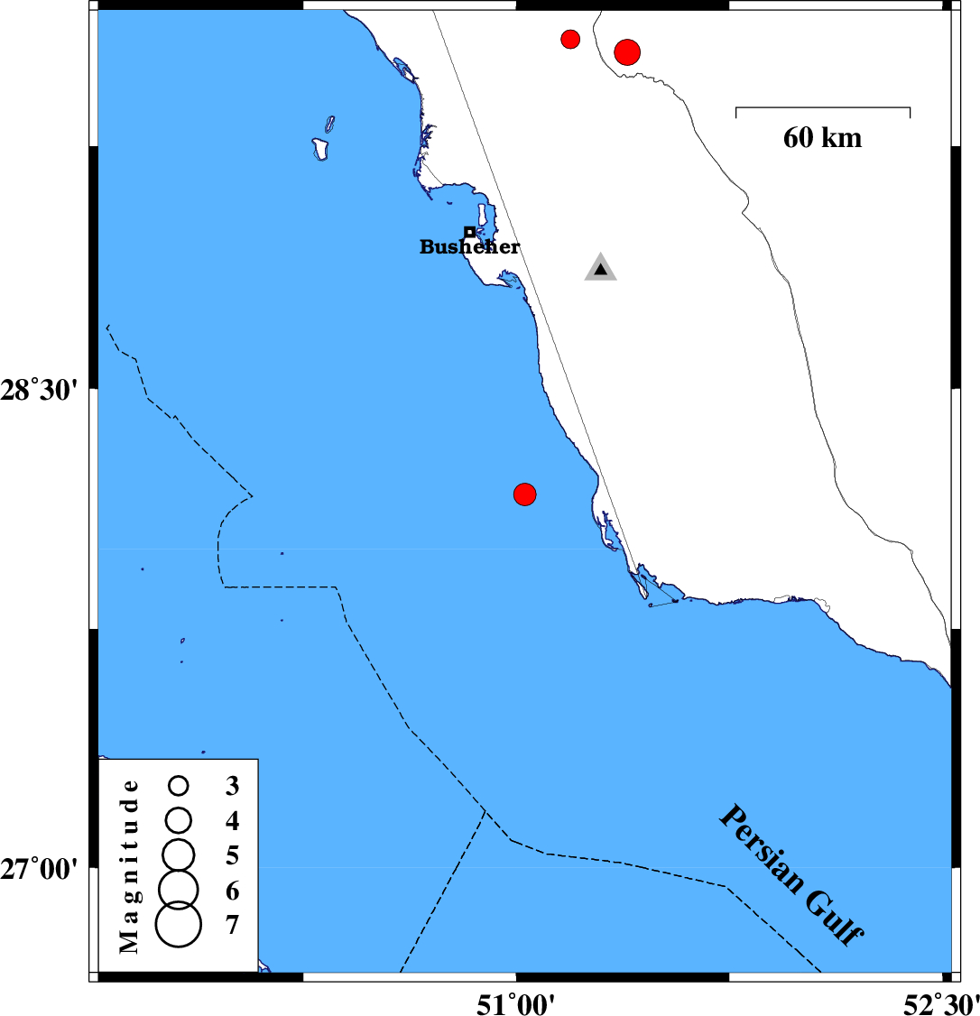 | 2011/08/27 | 01:49:19.7 | 06:19:19.7 | 29.58 | 51.19 | 14 | ML:2.9 | Bushehr Province, 35 km North of Borazjan |