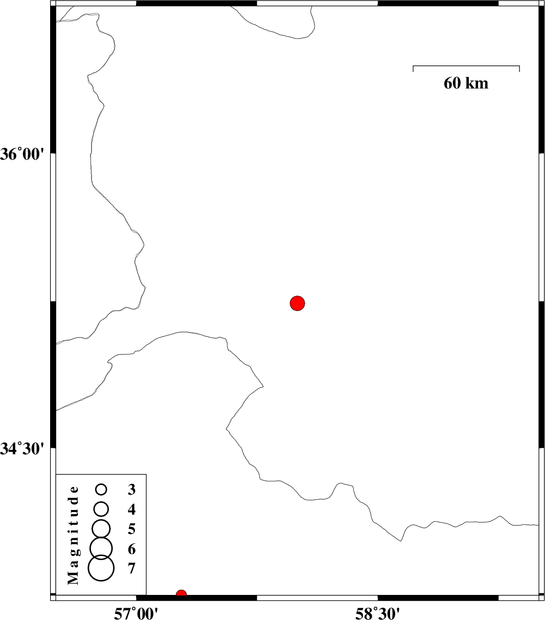 | 2011/08/10 | 22:24:22.1 | 02:54:22.1 | 33.74 | 57.28 | 17 | ML:2.9 | Khorasan(center) Province, 36 km North-East of Tabas |