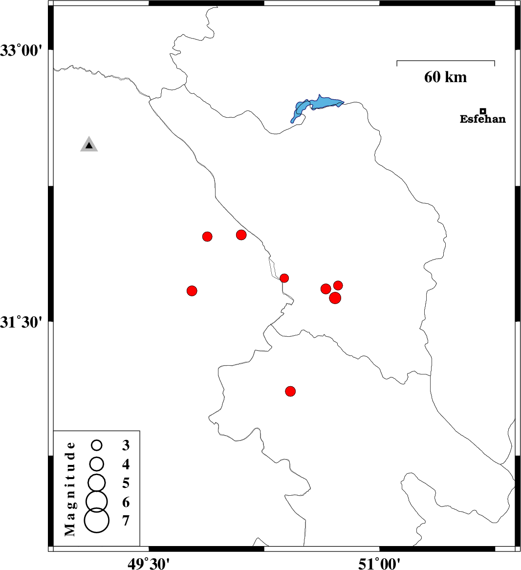 | 2011/08/23 | 13:46:44.1 | 18:16:44.1 | 31.63 | 50.71 | 14 | ML:3.4 | Chaharmahal Bakhtiari Province, 17 km North-West of Lordegan | ||