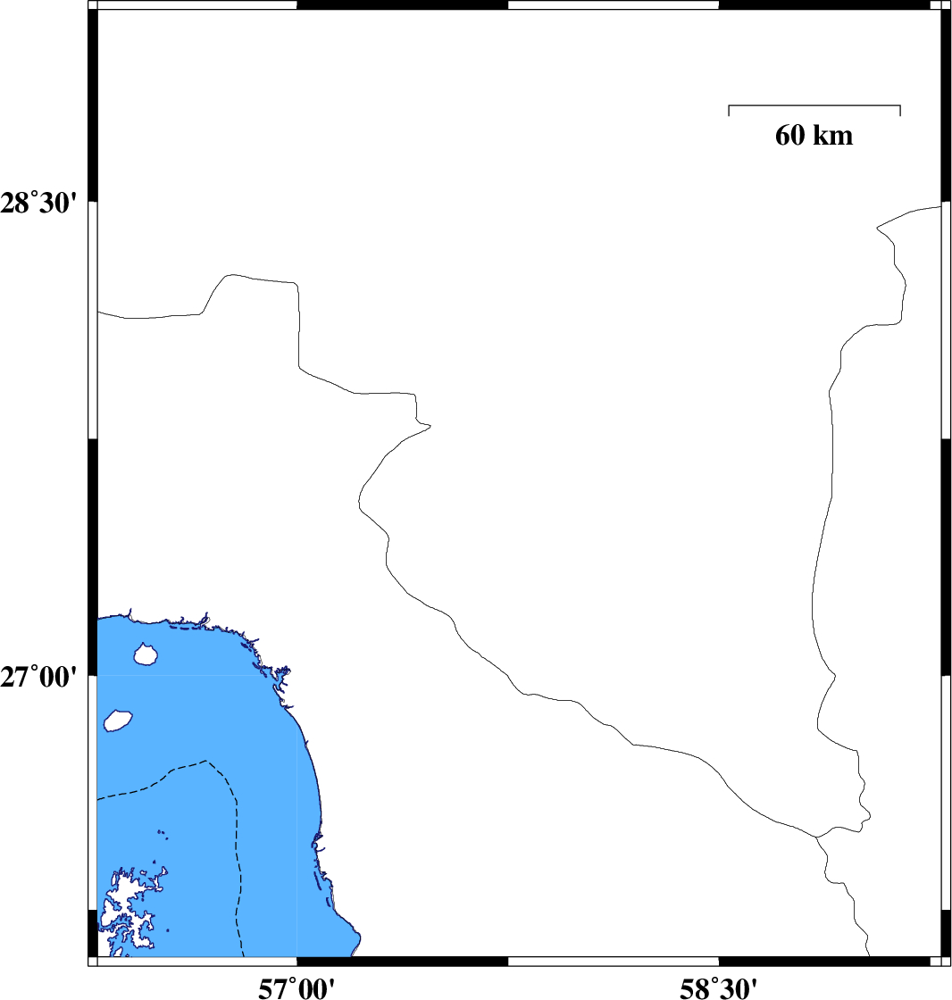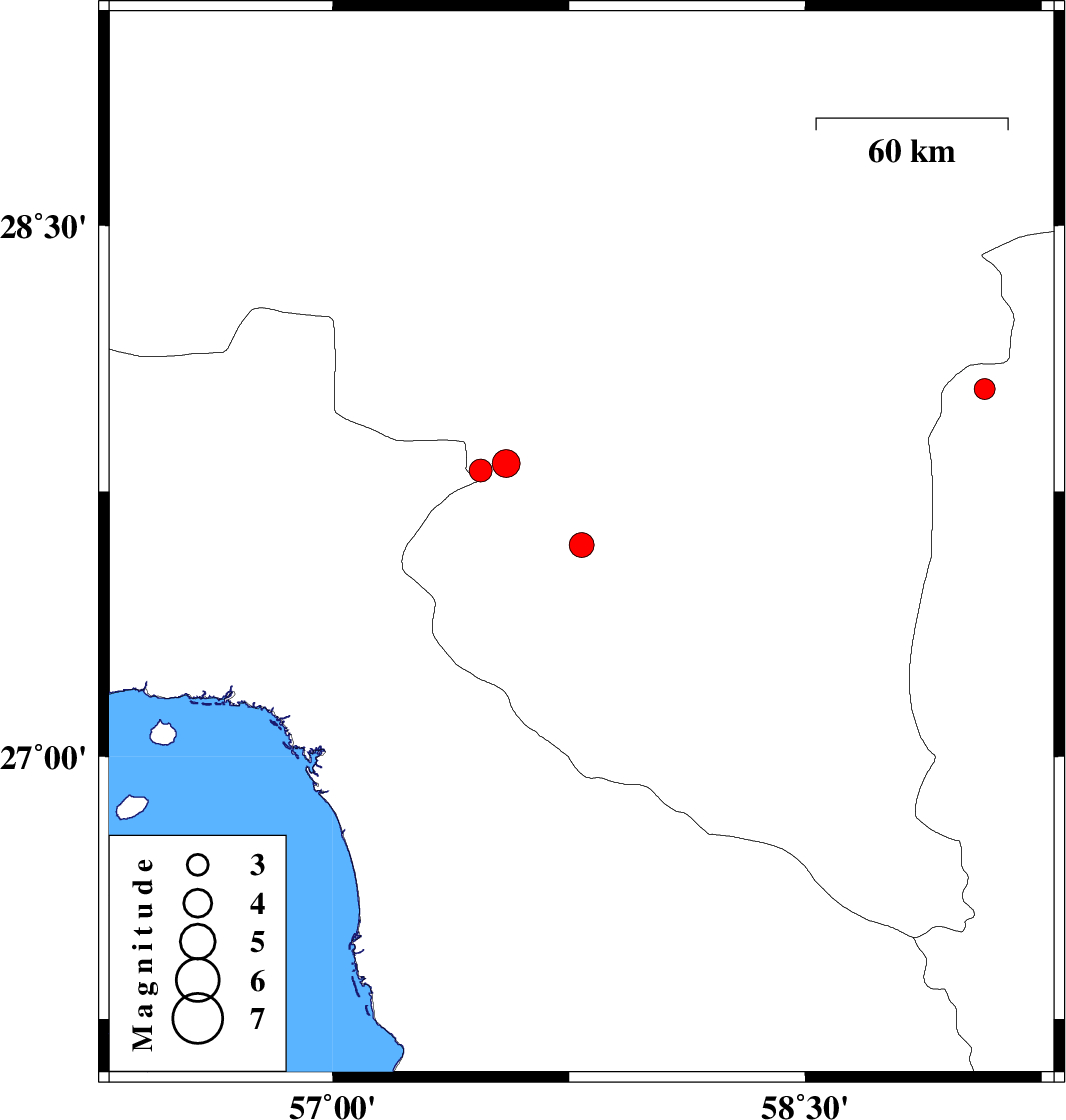 | 2011/08/21 | 01:54:46.4 | 06:24:46.4 | 27.83 | 57.55 | 31 | ML:4 | Kerman Province, 19 km South-West of Kahnuj |