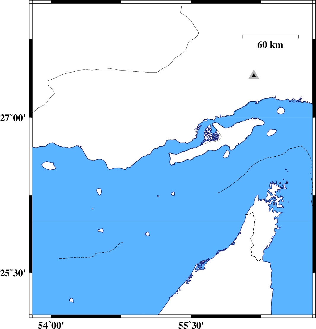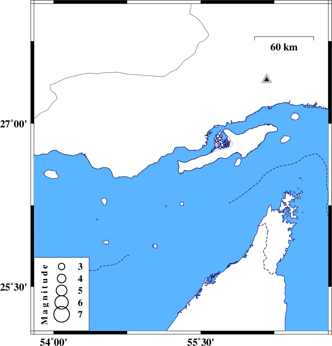 | 2011/09/15 | 04:46:07.7 | 09:16:07.7 | 26.59 | 55.3 | 31 | ML:3.6 | Persian Gulf, 45 km East of Bandar-e lengeh |