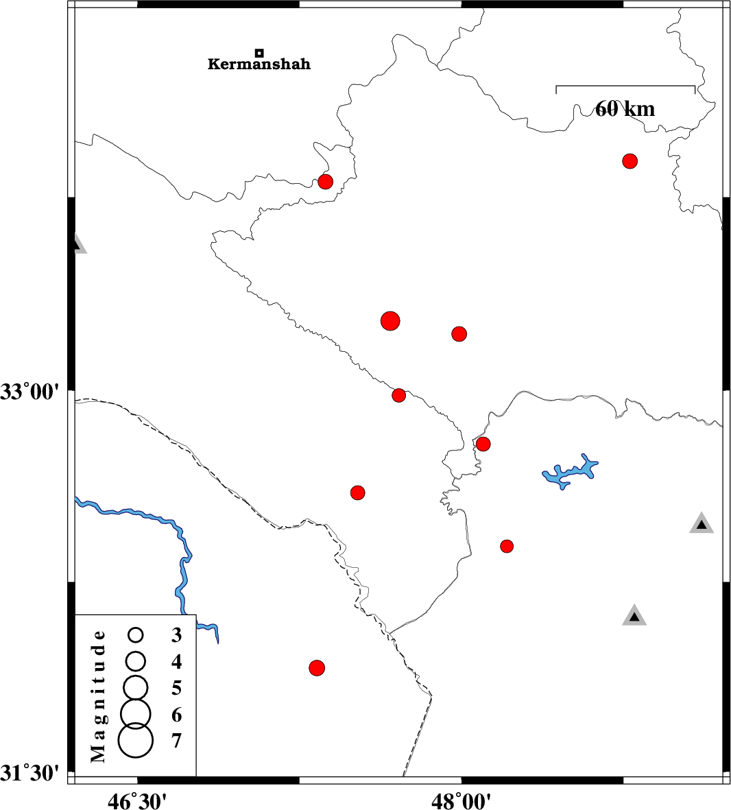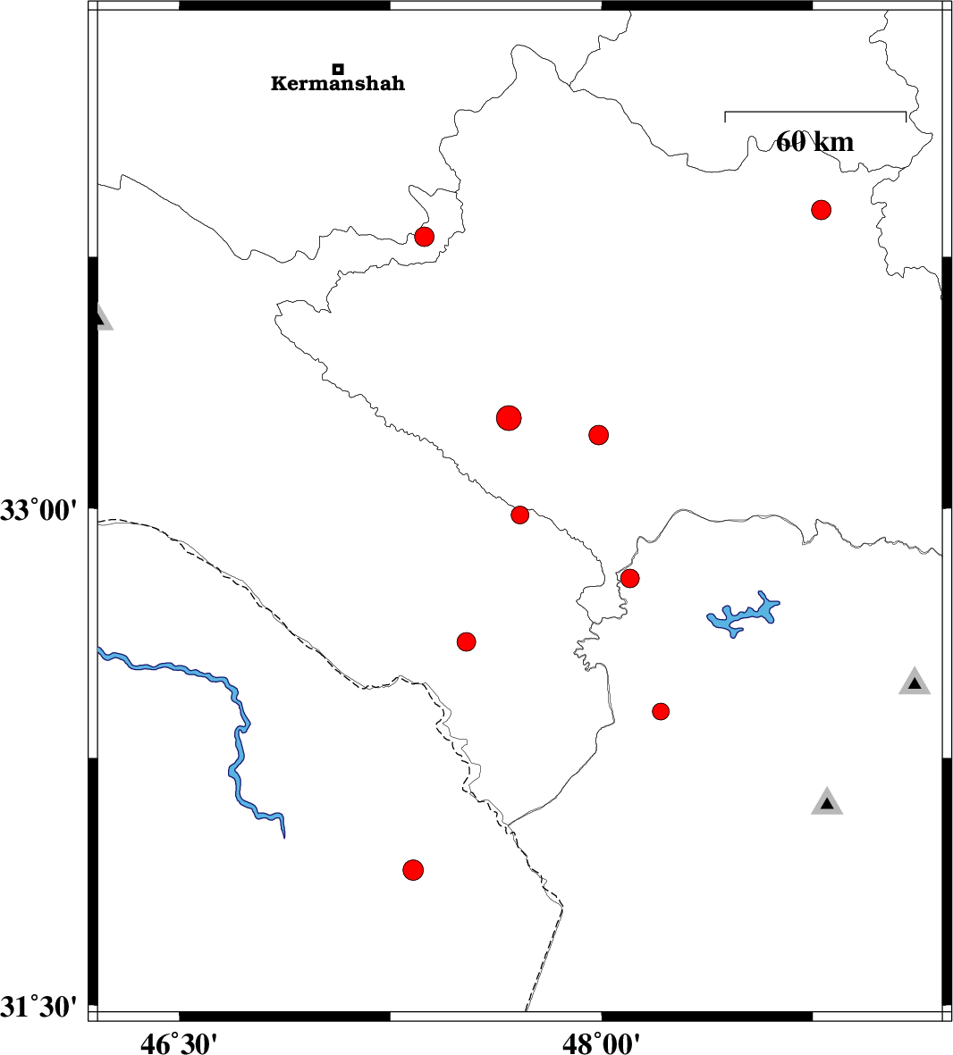 | 2011/09/10 | 14:36:18.1 | 19:06:18.1 | 31.91 | 47.33 | 37 | ML:3.3 | Iraq, 88 km South of Dehloran | ||