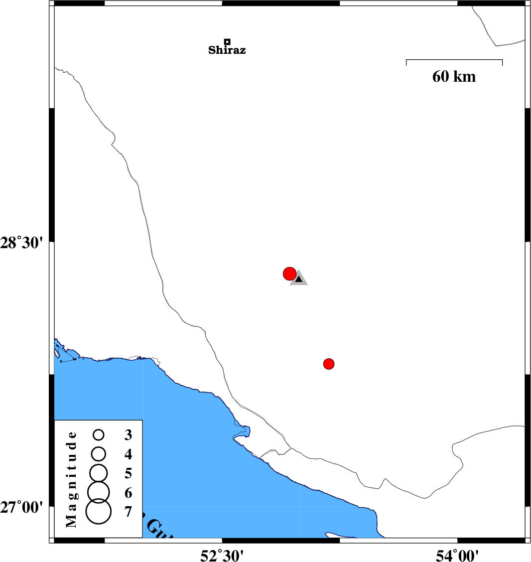 | 2011/09/17 | 23:37:29.9 | 04:07:29.9 | 28.32 | 52.93 | 6 | ML:3.8 | Fars Province, 19 km South-West of Qir va Karzin | ||