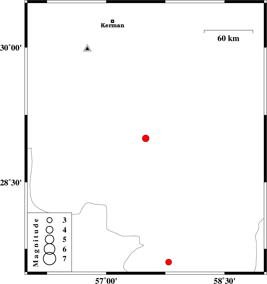 | 2011/09/13 | 05:05:08.6 | 09:35:08.6 | 27.6 | 57.79 | 40 | ML:3.5 | Kerman Province, 41 km South of Kahnuj |