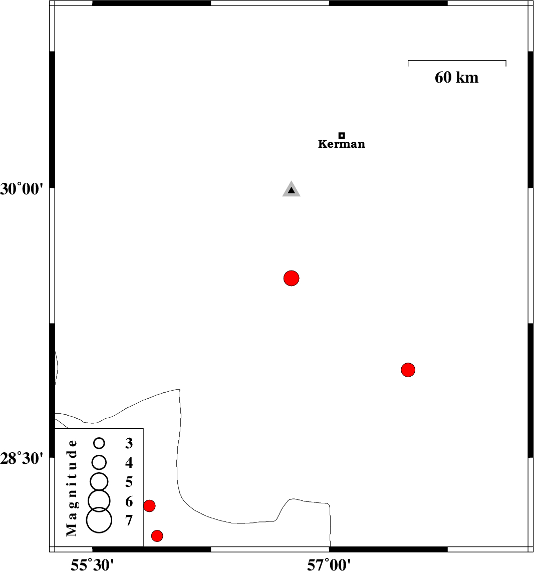 | 2011/09/18 | 02:38:51.3 | 07:08:51.3 | 28.99 | 57.5 | 17 | ML:3.9 | Kerman Province, 43 km North-West of Jiroft | ||