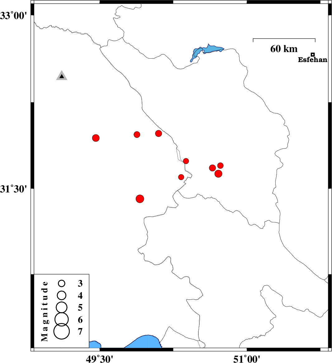 | 2011/08/23 | 13:46:44.1 | 18:16:44.1 | 31.63 | 50.71 | 14 | ML:3.4 | Chaharmahal Bakhtiari Province, 17 km North-West of Lordegan | ||