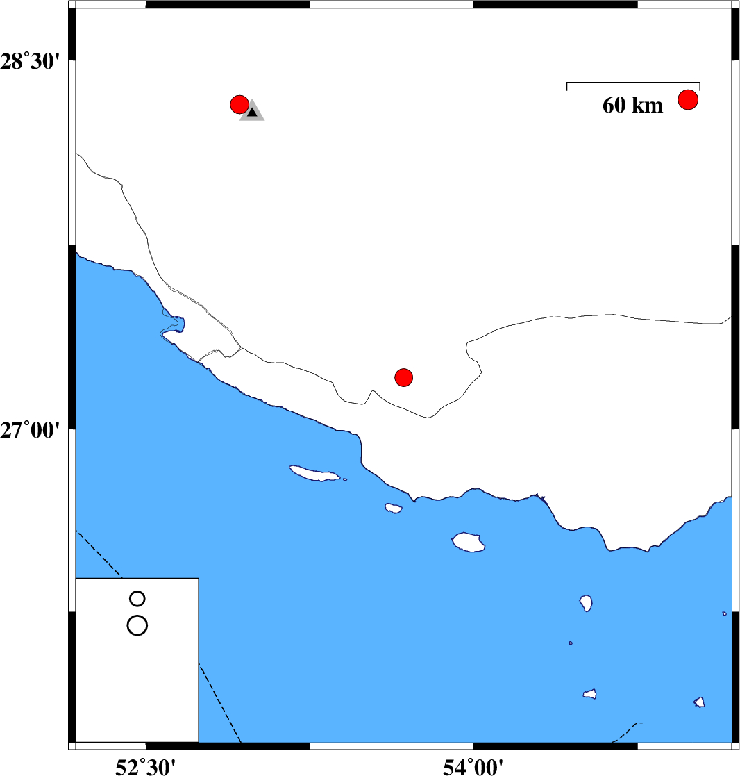 | 2011/09/20 | 20:23:42.3 | 00:53:42.3 | 27.21 | 53.68 | 29 | ML:3.6 | Fars Province, 53 km South-East of Lamerd | ||