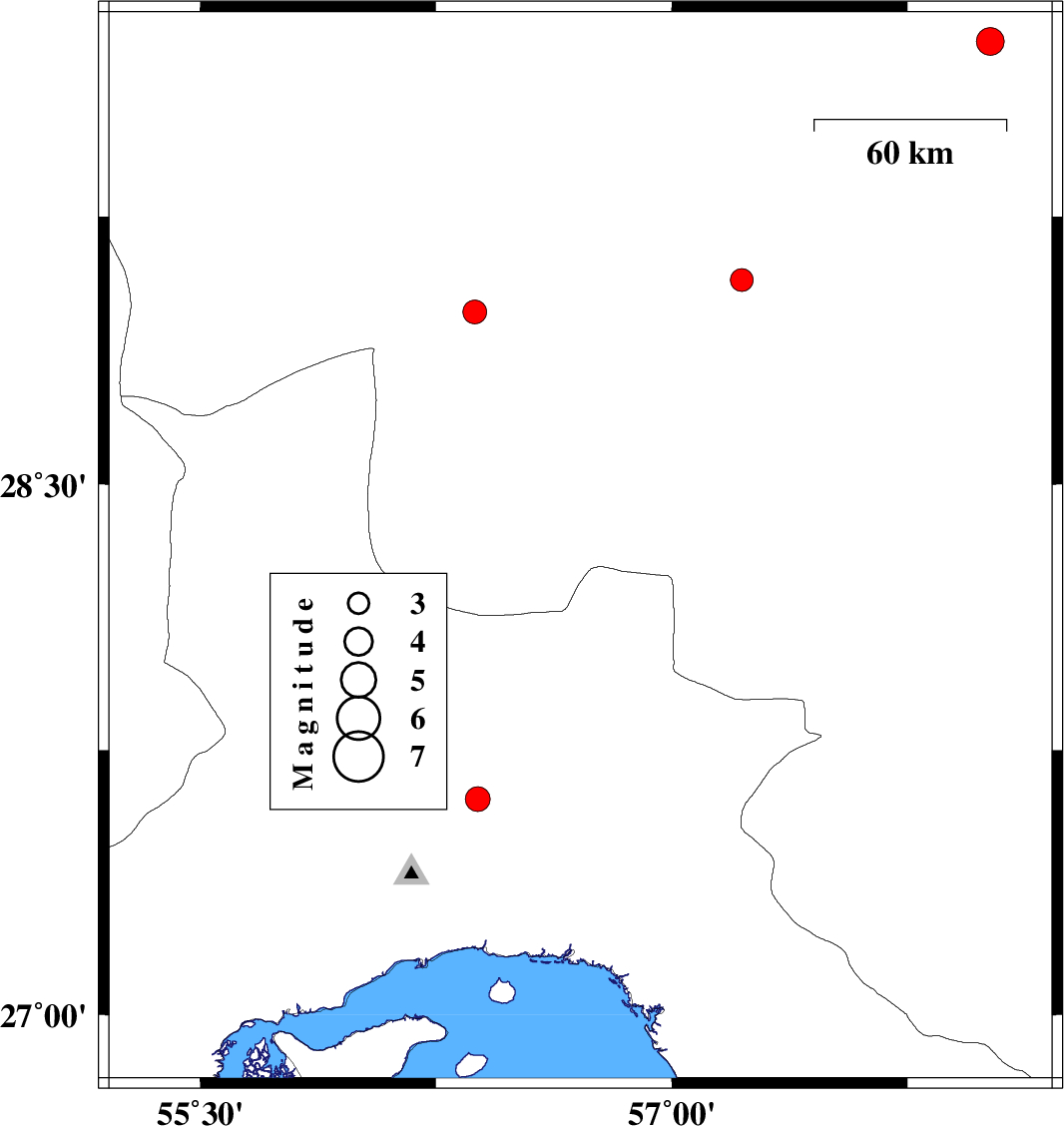 | 2011/09/13 | 05:05:08.6 | 09:35:08.6 | 27.6 | 57.79 | 40 | ML:3.5 | Kerman Province, 41 km South of Kahnuj | ||