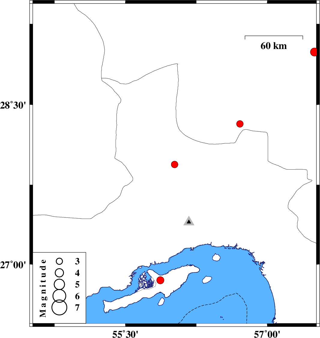 | 2011/09/24 | 07:18:04.2 | 10:48:04.2 | 27.94 | 56.02 | 7 | ML:3.3 | Hormozgan Province, 42 km South-East of Hajiabad | ||