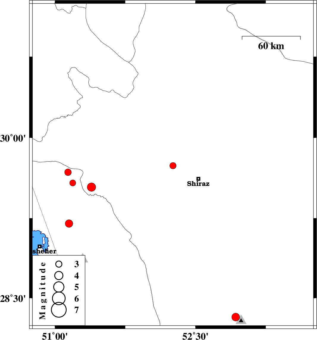 | 2011/08/27 | 01:49:19.7 | 06:19:19.7 | 29.58 | 51.19 | 14 | ML:2.9 | Bushehr Province, 35 km North of Borazjan |