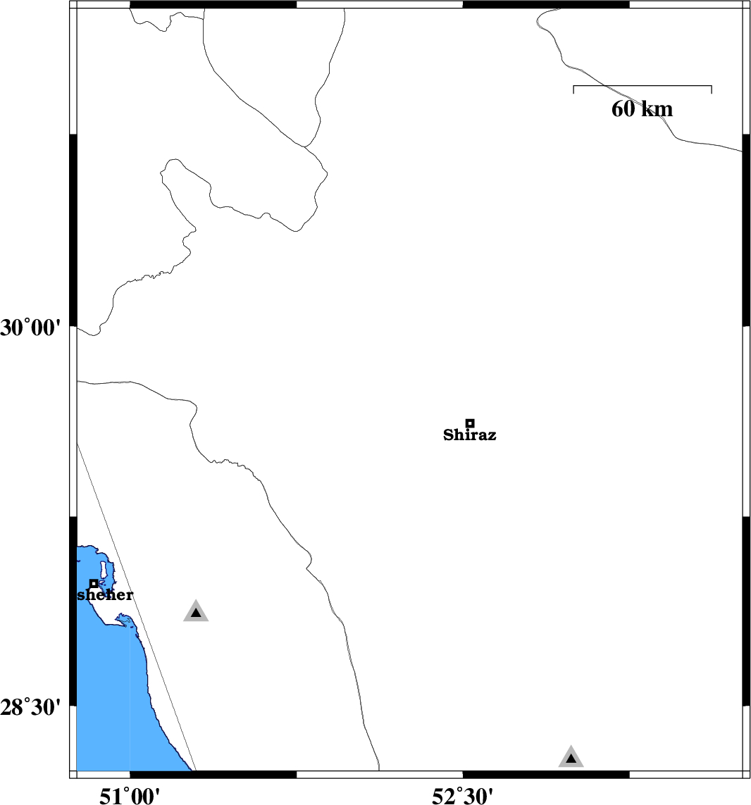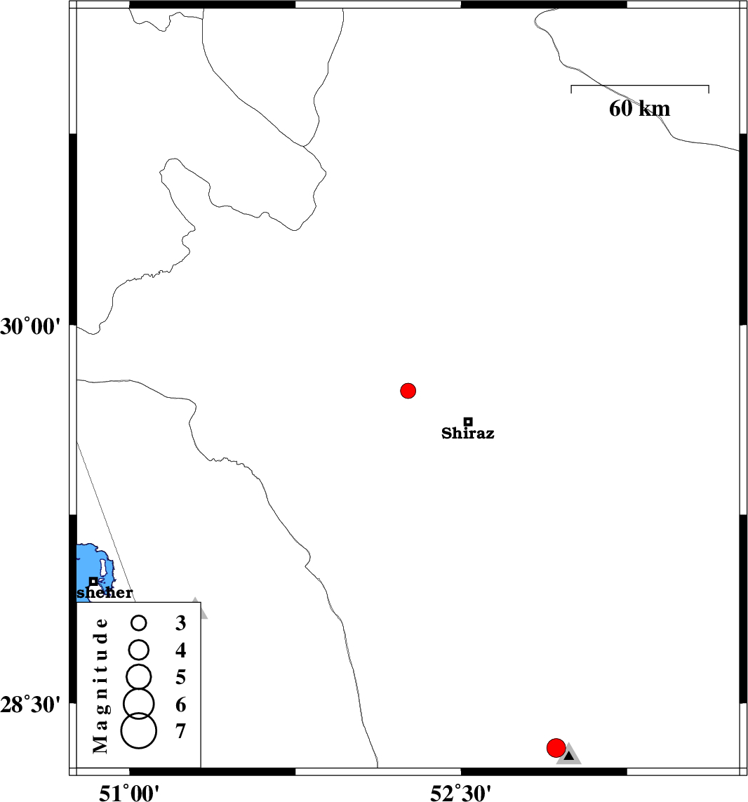 | 2011/09/17 | 23:37:29.9 | 04:07:29.9 | 28.32 | 52.93 | 6 | ML:3.8 | Fars Province, 19 km South-West of Qir va Karzin |
