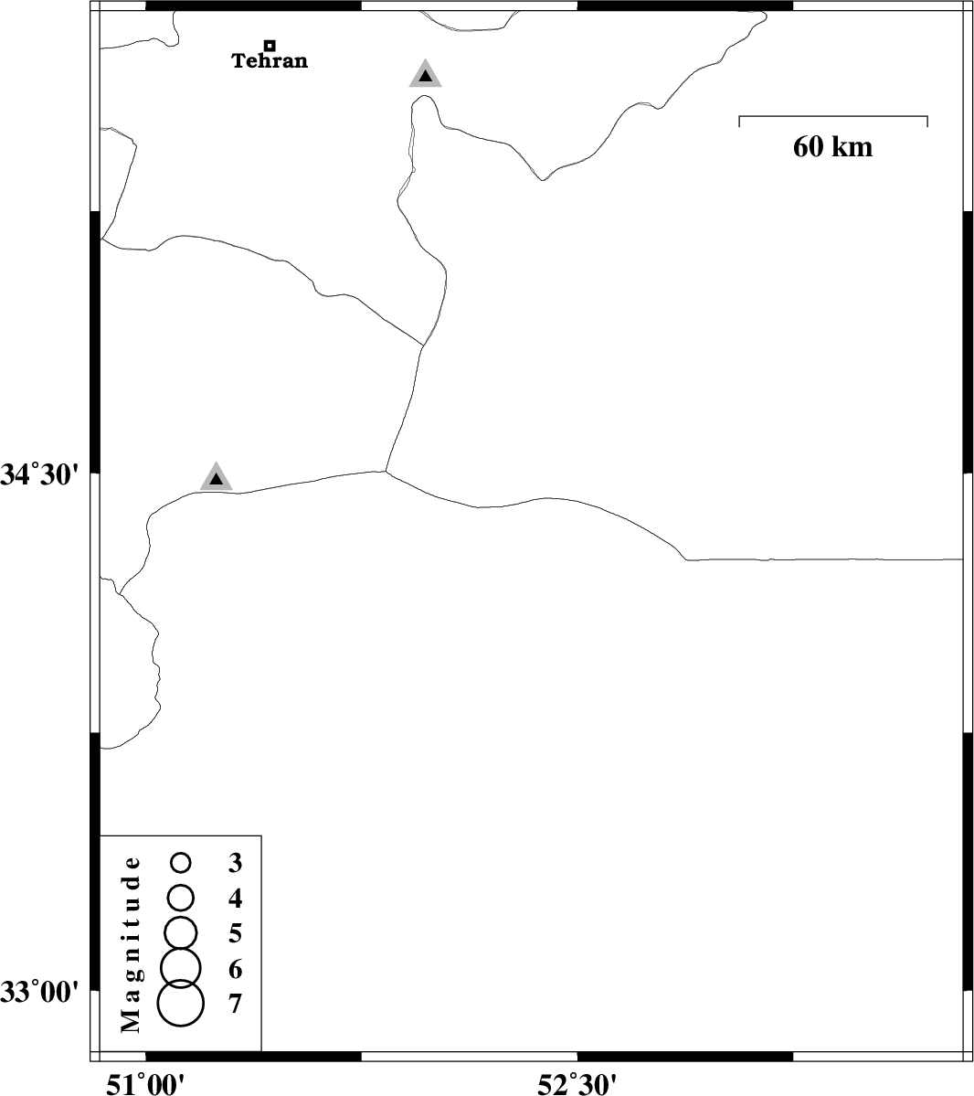 | 2011/09/30 | 03:29:57.8 | 06:59:57.8 | 34.32 | 52.34 | 14 | ML:2.5 | Esfahan Province, 100 km South of Garmsar |