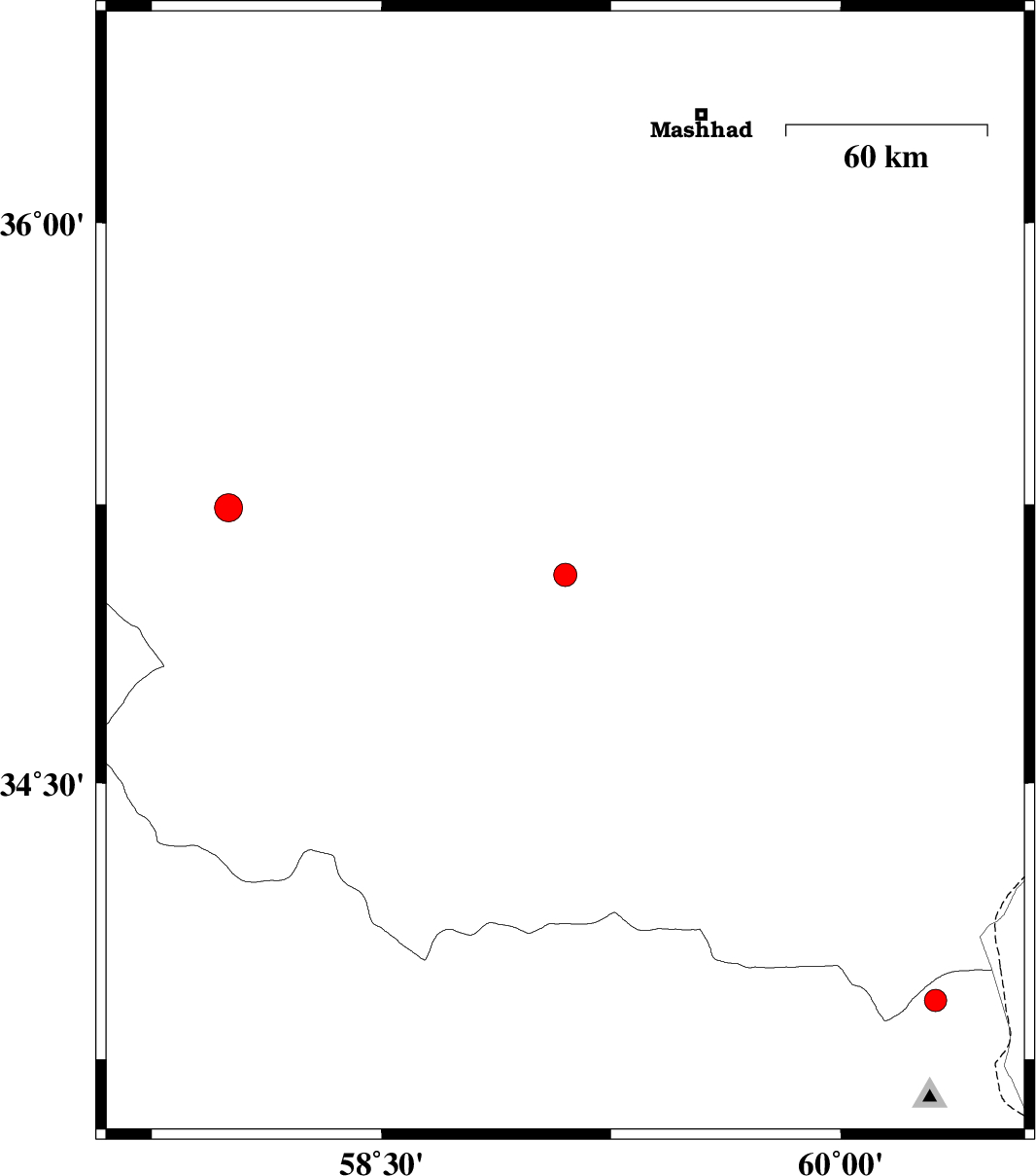 2011/10/01 | 06:25:47.5 | 09:55:47.5 | 35.06 | 59.1 | 14 | ML:3.4 | Khorasan(center) Province, 26 km South-West of Torbat-e heydariyeh | ||