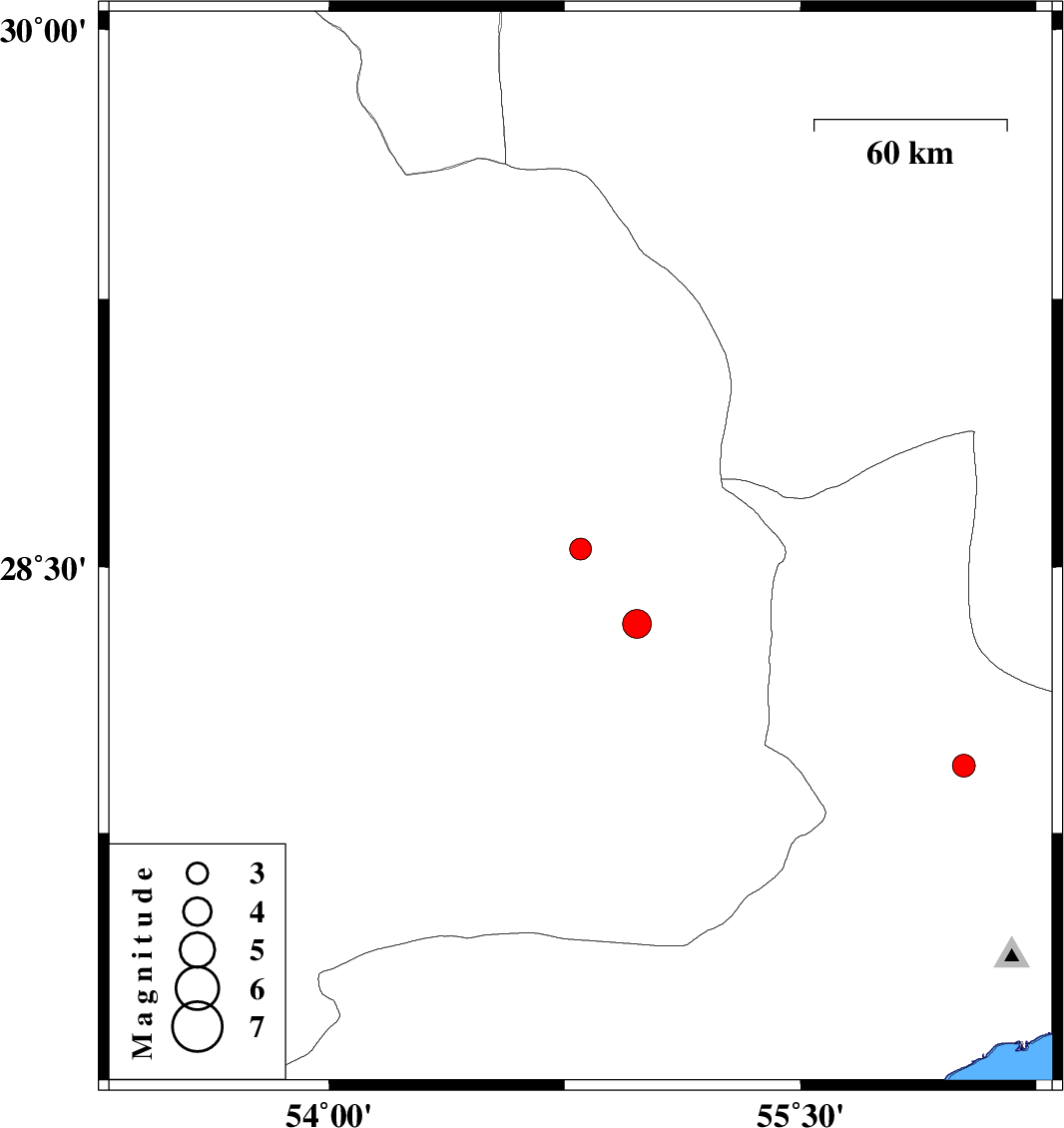 | 2011/09/16 | 23:07:42.0 | 03:37:42.0 | 28.34 | 54.98 | 41 | ML:4.1 | Fars Province, 63 km South-East of Darab |