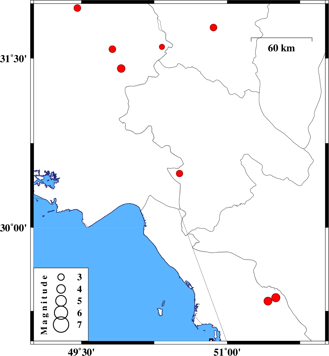 | 2011/09/14 | 15:29:55.4 | 19:59:55.4 | 31.41 | 49.91 | 18 | ML:3.7 | Khoozestan Province, 12 km South of Bagh Malek |