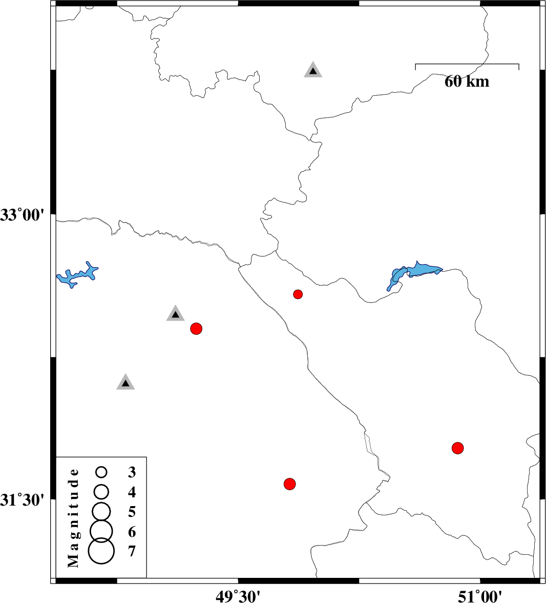 | 2011/10/02 | 01:28:32.9 | 04:58:32.9 | 31.77 | 50.86 | 14 | ML:3.3 | Chaharmahal Bakhtiari Province, 30 km North of Lordegan |
