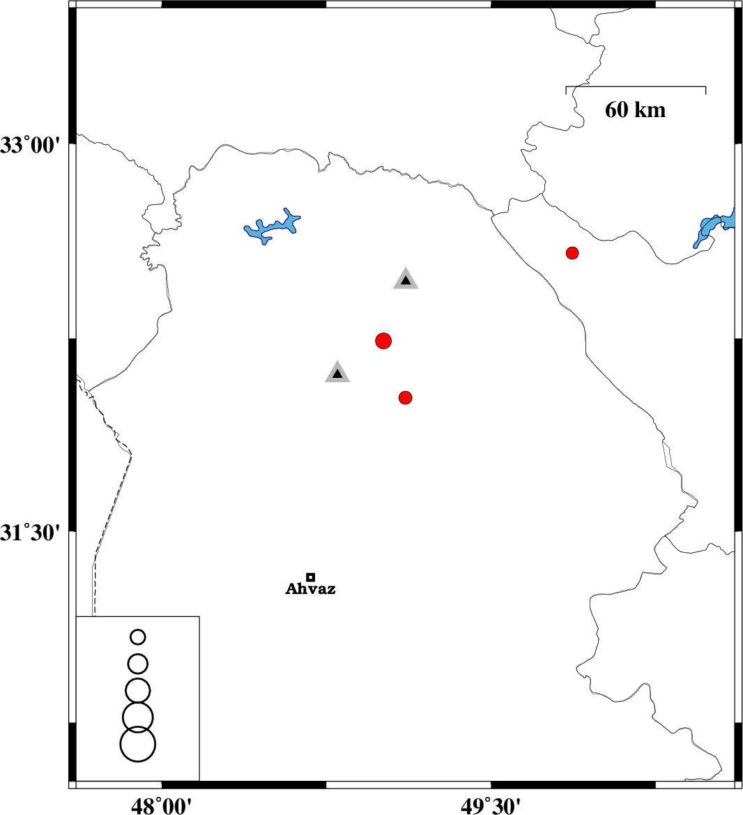 2011/10/11 | 00:40:22.7 | 04:10:22.7 | 32.24 | 49.01 | 14 | ML:3.3 | Khoozestan Province, 19 km South of Lali | ||
