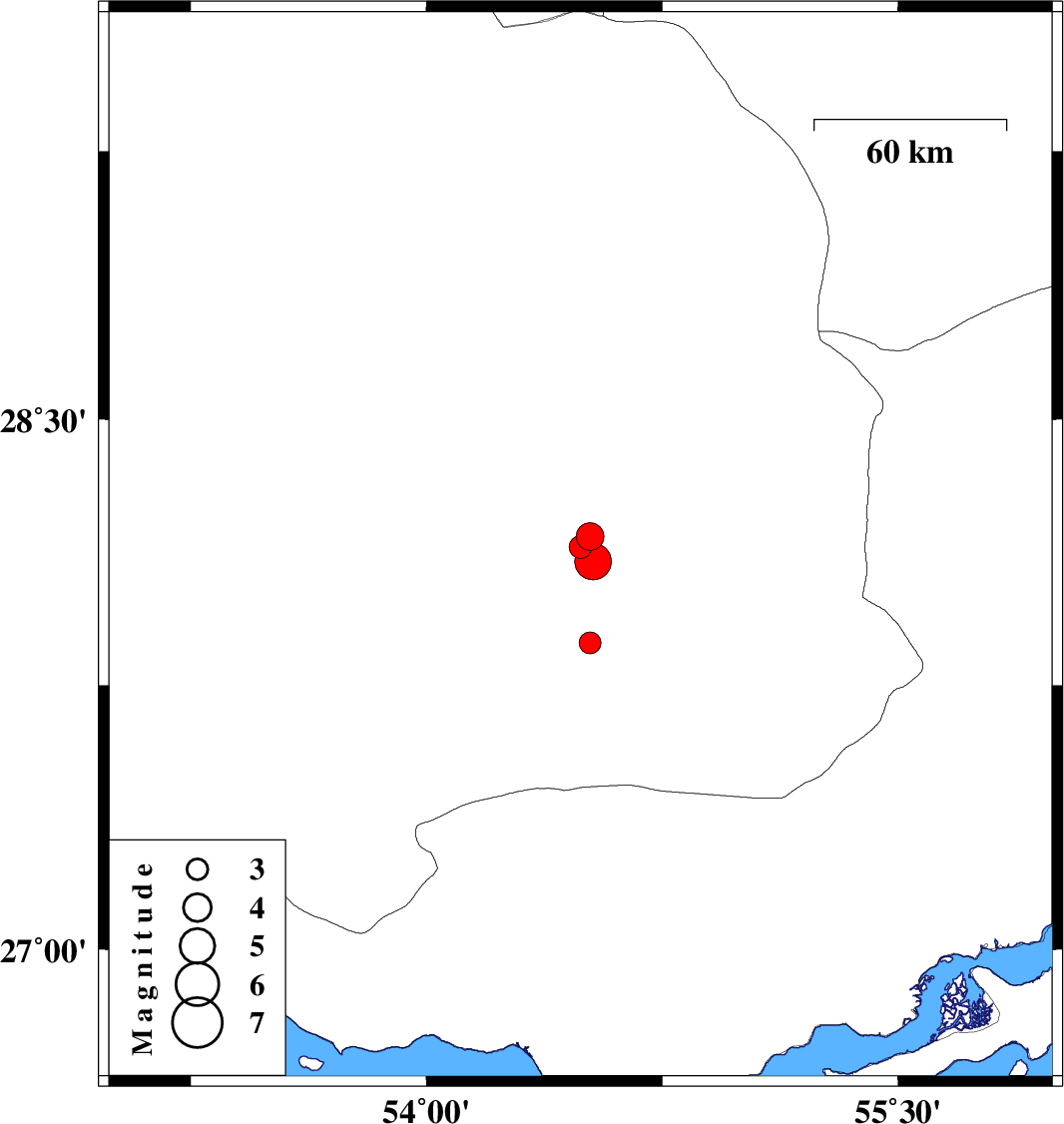| 2011/10/19 | 02:52:40.2 | 06:22:40.2 | 28.1 | 54.53 | 18 | ML:5.2 | Fars Province, 50 km North-East of Lar | ||