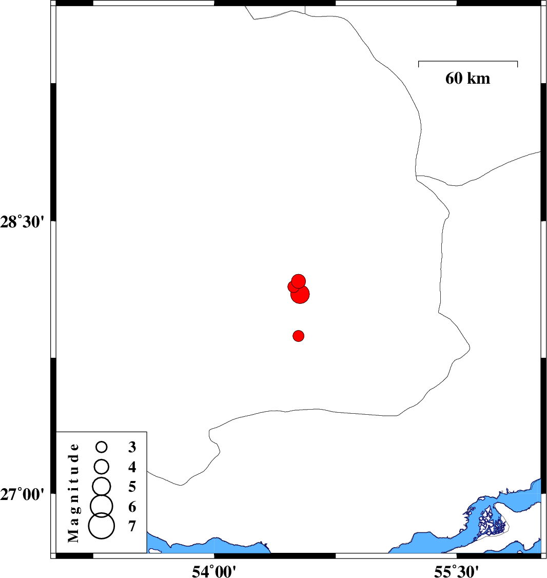 | 2011/10/19 | 02:52:40.2 | 06:22:40.2 | 28.1 | 54.53 | 18 | ML:5.2 | Fars Province, 50 km North-East of Lar | ||