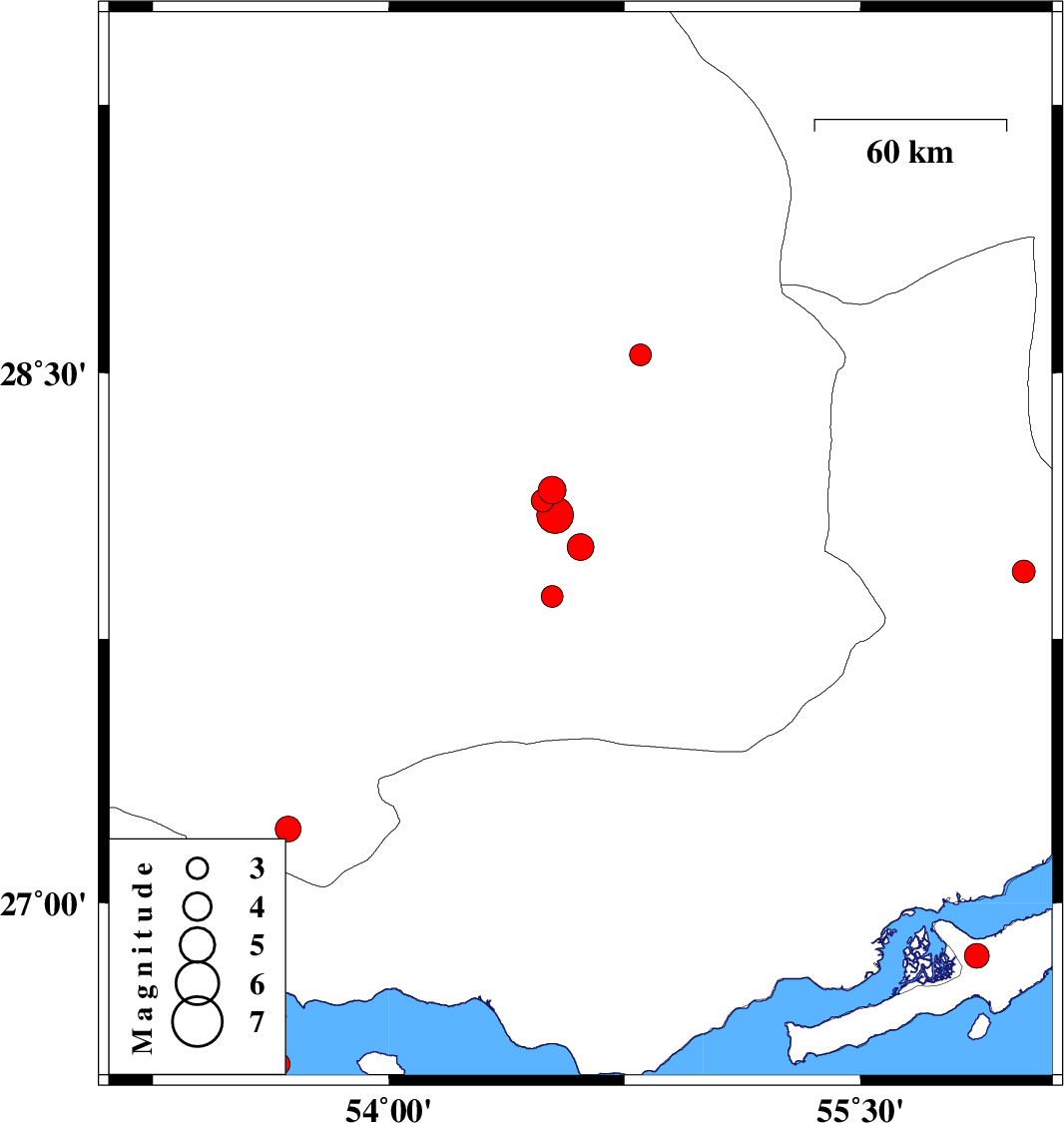 | 2011/10/19 | 02:52:40.2 | 06:22:40.2 | 28.1 | 54.53 | 18 | ML:5.2 | Fars Province, 50 km North-East of Lar | ||