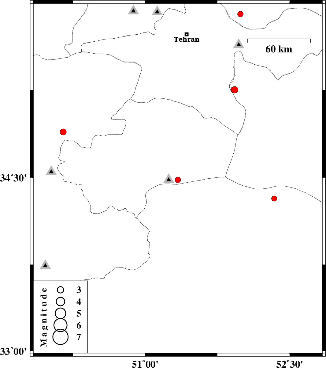 | 2011/10/07 | 00:39:11.2 | 04:09:11.2 | 35.25 | 51.93 | 15 | ML:3.1 | Semnan Province, 25 km East of Varamin | ||