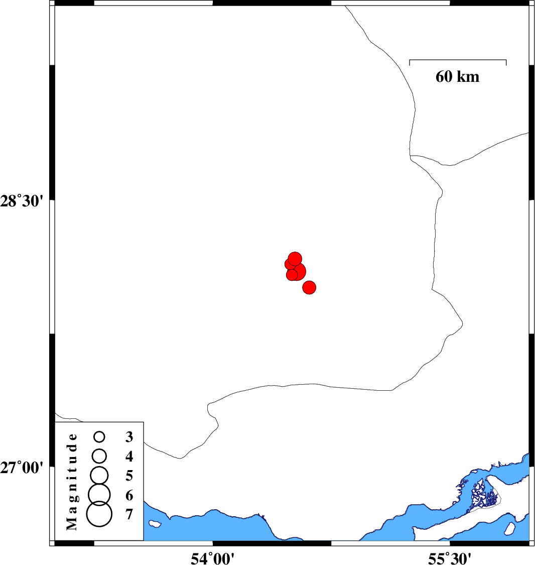 | 2011/10/19 | 02:52:40.2 | 06:22:40.2 | 28.1 | 54.53 | 18 | ML:5.2 | Fars Province, 50 km North-East of Lar |