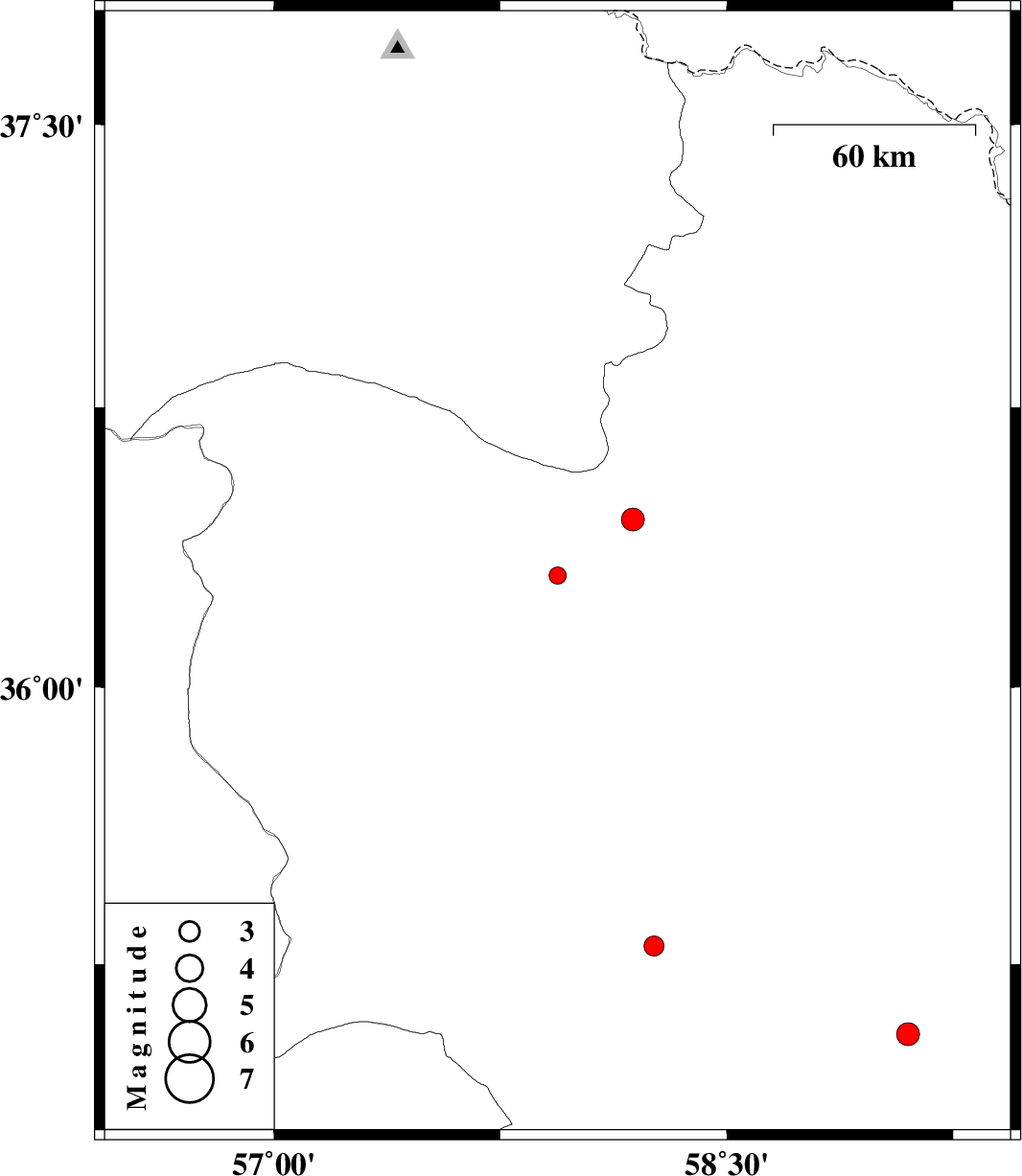 | 2011/10/18 | 20:08:47.5 | 23:38:47.5 | 36.45 | 58.19 | 19 | ML:3.4 | Khorasan(center) Province, 53 km North-East of Sabzevar | ||