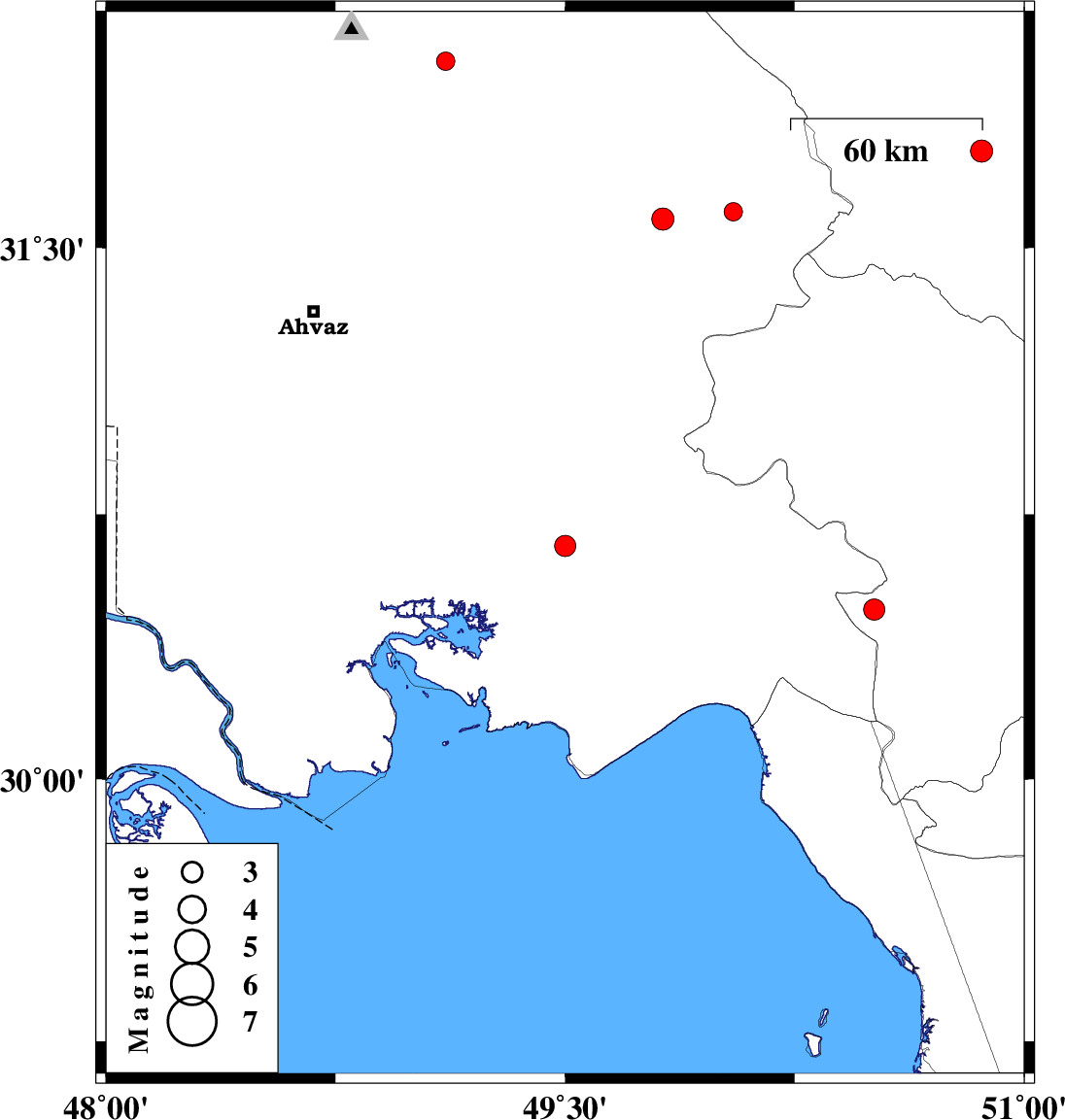 | 2011/10/24 | 06:56:11.6 | 10:26:11.6 | 30.66 | 49.5 | 36 | ML:3.1 | Khoozestan Province, 24 km South-West of Omidiyeh | ||