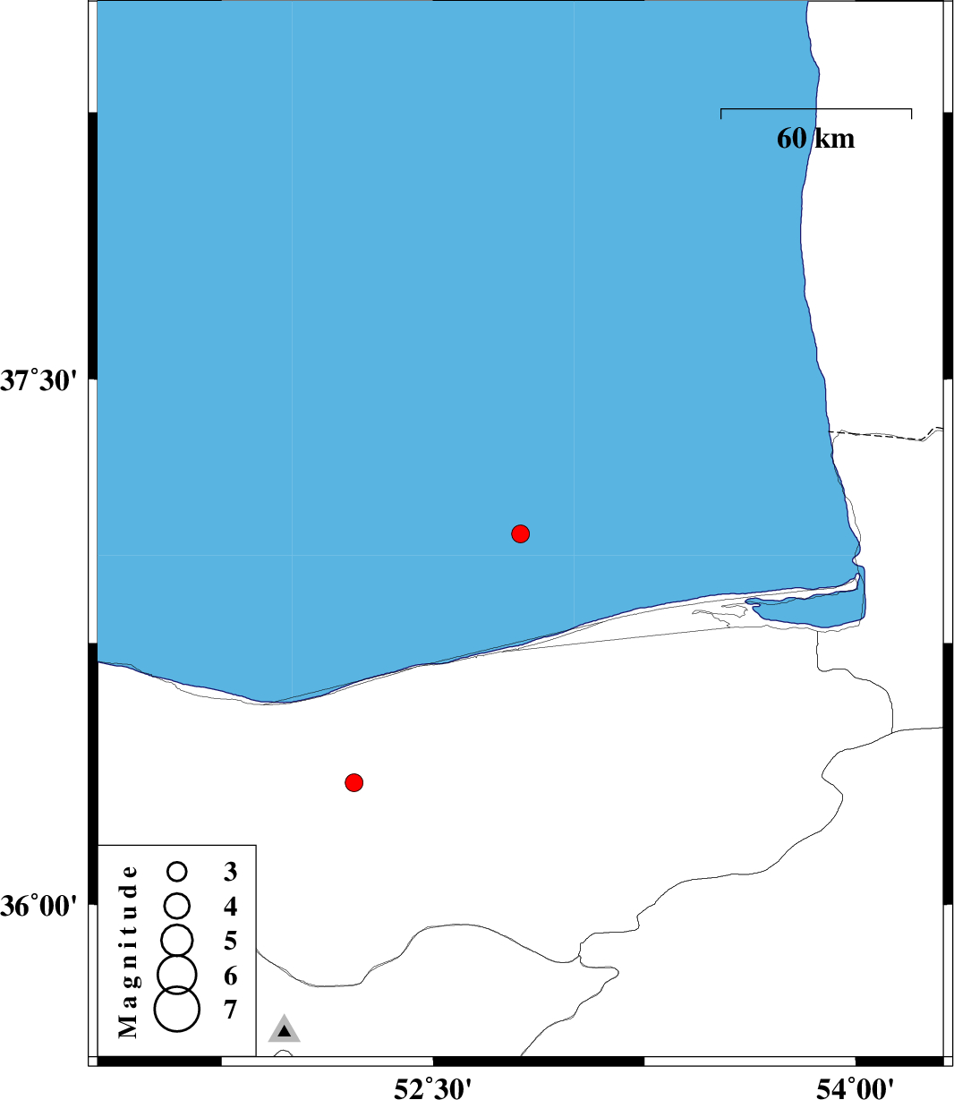 | 2011/10/26 | 17:09:54.6 | 20:39:54.6 | 37.06 | 52.81 | 17 | ML:2.8 | Caspian Sea, 43 km North-East of Babolsar | ||