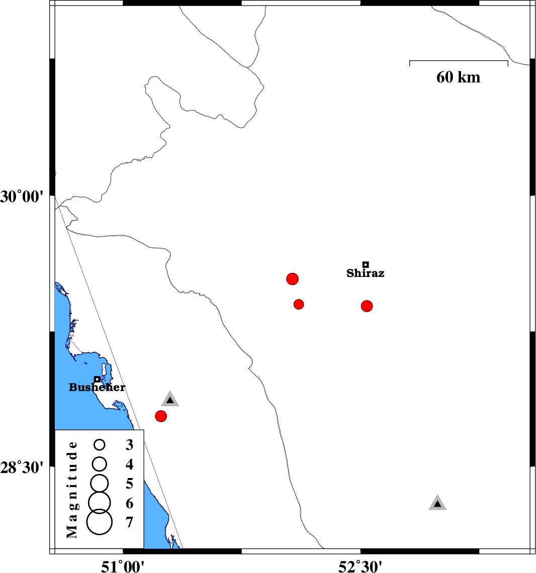 | 2011/10/09 | 12:05:13.2 | 15:35:13.2 | 29.39 | 52.54 | 42 | ML:3.2 | Fars Province, 26 km South of Shiraz | ||