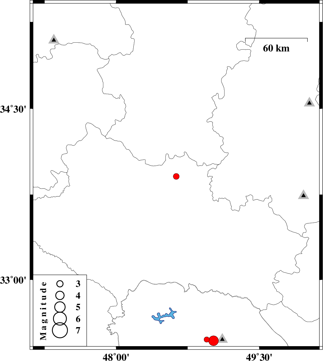 | 2011/10/29 | 17:27:32.6 | 20:57:32.6 | 33.91 | 48.63 | 18 | ML:2.8 | Lorestan Province, 12 km West of Borujerd | ||