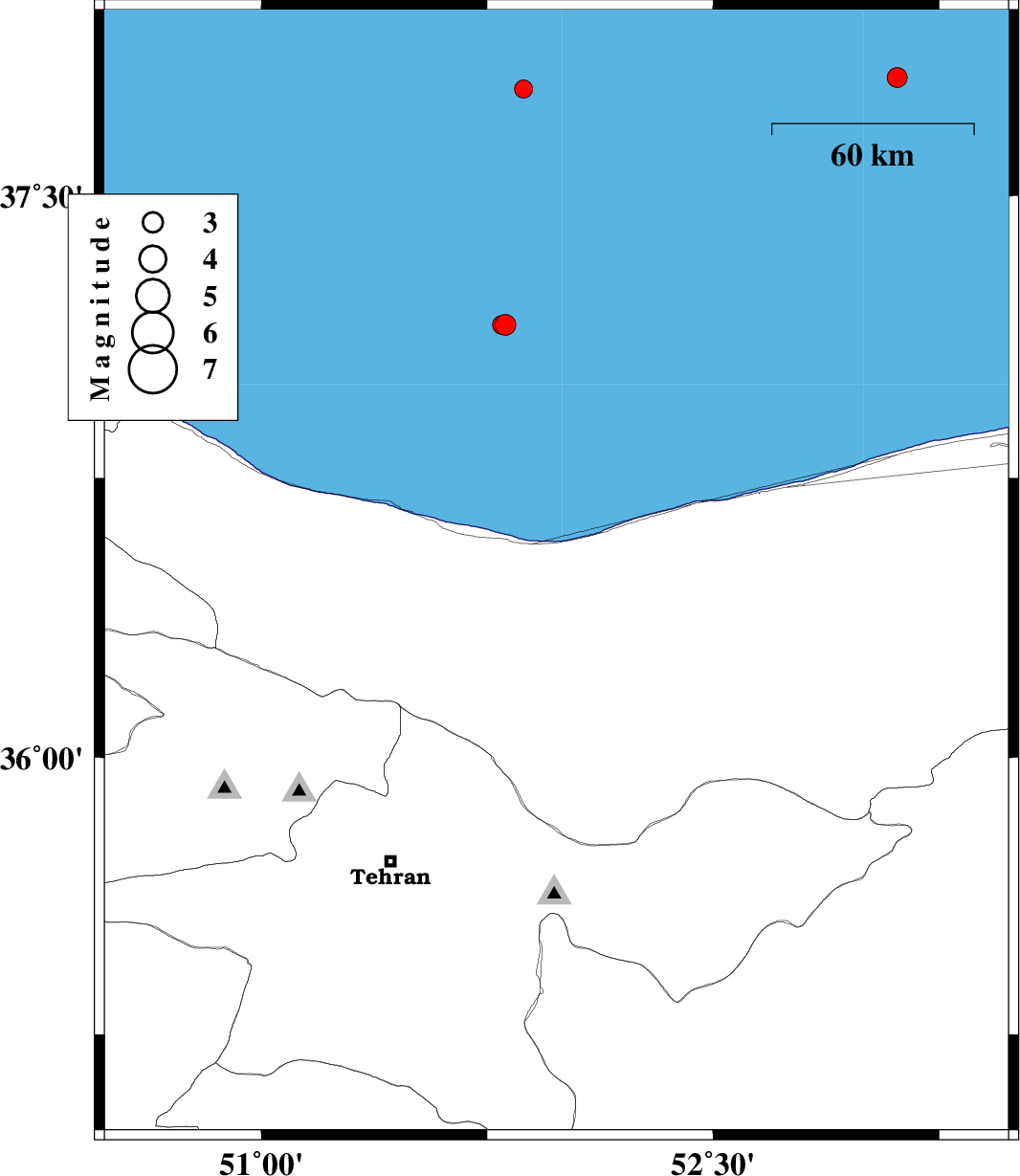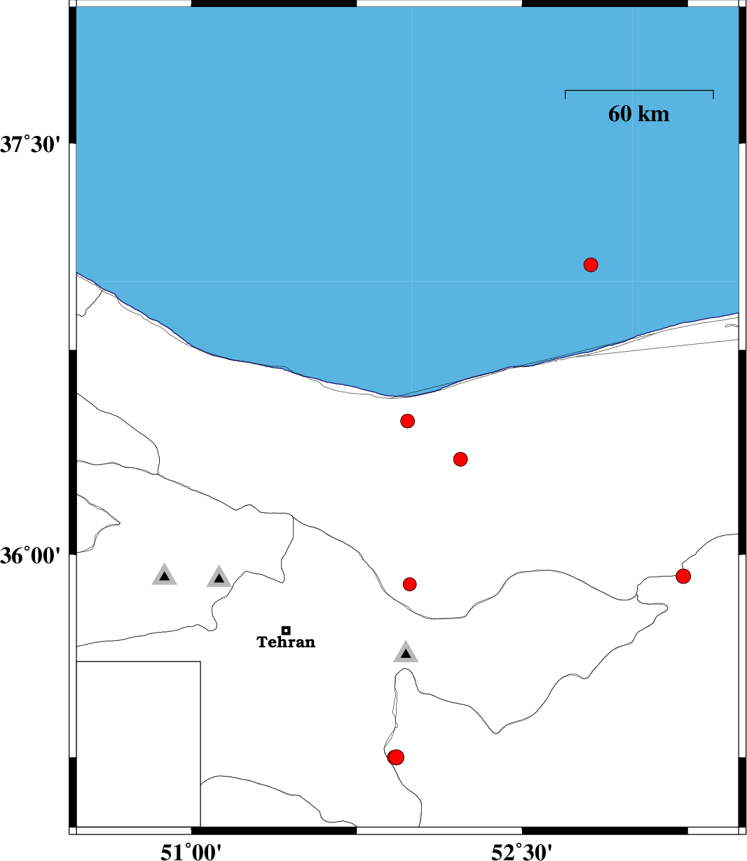 | 2011/10/26 | 17:09:54.6 | 20:39:54.6 | 37.06 | 52.81 | 17 | ML:2.8 | Caspian Sea, 43 km North-East of Babolsar | ||