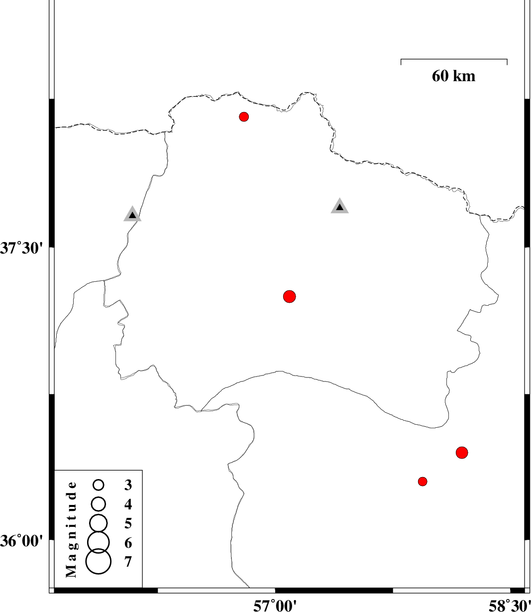 | 2011/11/07 | 05:50:45.3 | 09:20:45.3 | 37.25 | 57.09 | 14 | ML:3.5 | Khorasan(north) Province, 36 km South-East of Ashkhaneh | ||