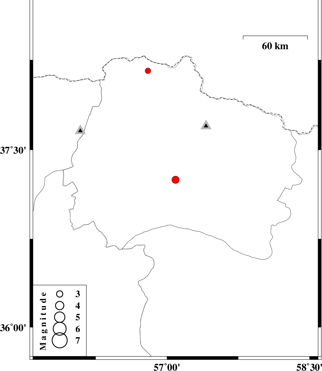 | 2011/11/07 | 05:50:45.3 | 09:20:45.3 | 37.25 | 57.09 | 14 | ML:3.5 | Khorasan(north) Province, 36 km South-East of Ashkhaneh | ||