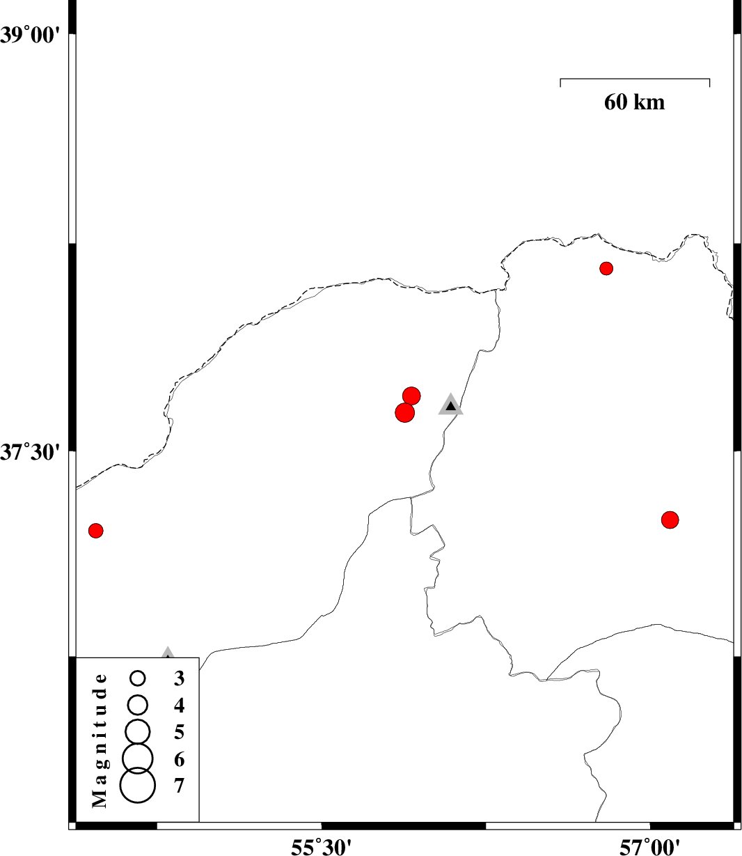 | 2011/11/09 | 01:20:39.8 | 04:50:39.8 | 37.64 | 55.88 | 14 | ML:3.9 | Golestan Province, 45 km North-East of Kalaleh | ||
