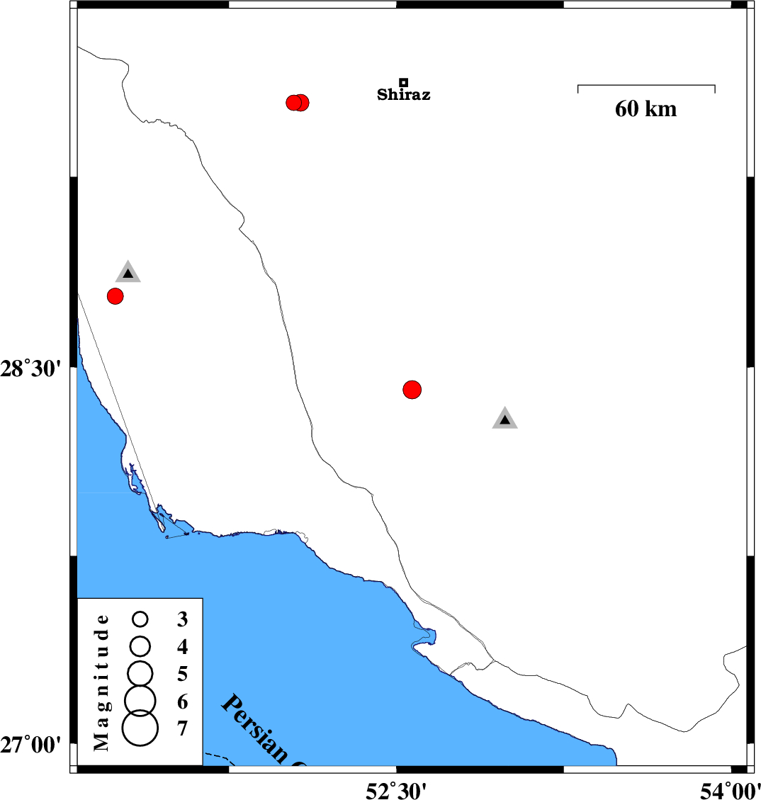| 2011/11/07 | 15:18:41.2 | 18:48:41.2 | 29.54 | 52.04 | 18 | ML:3.1 | Fars Province, 38 km East of Kazerun | ||