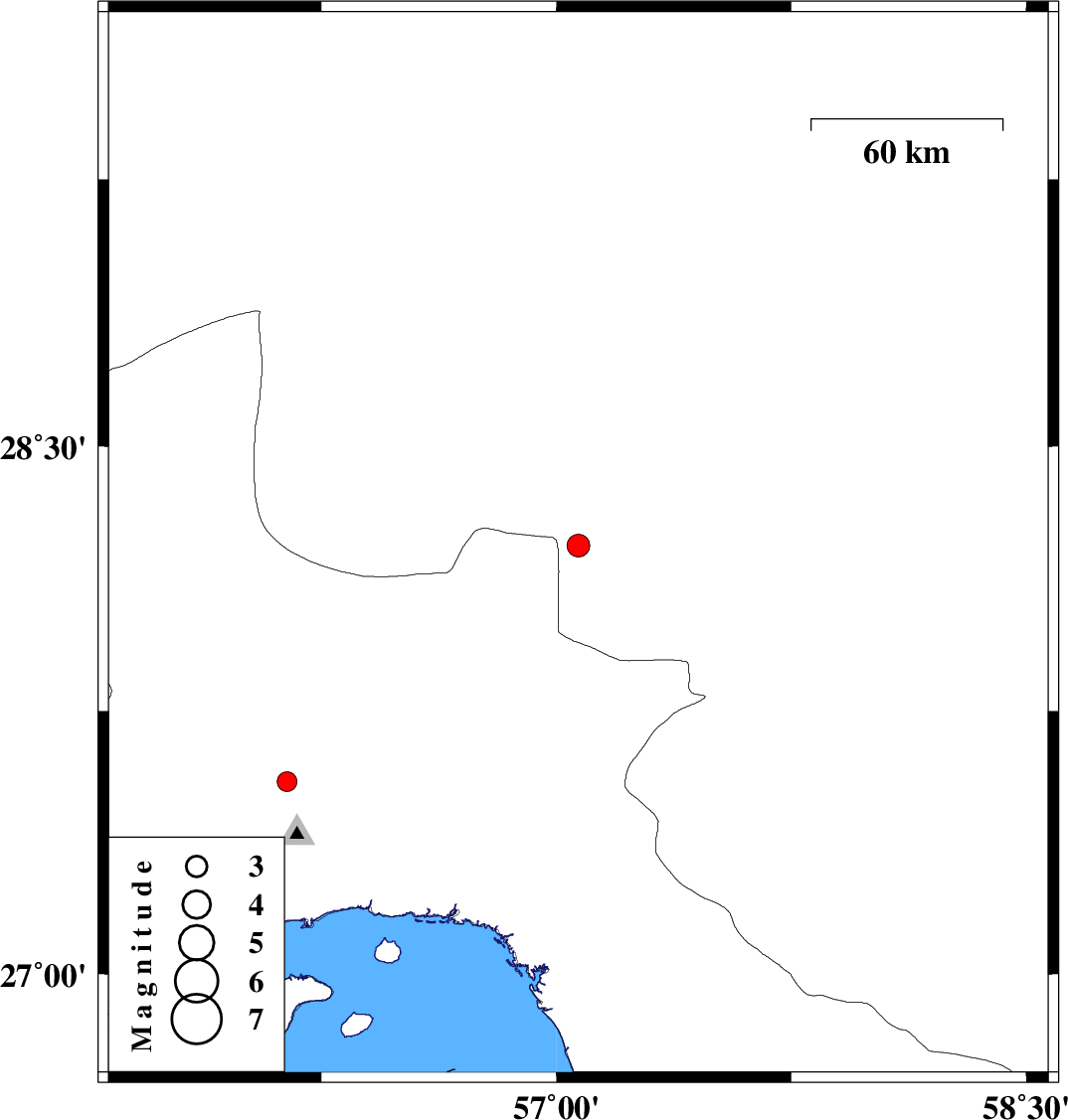 | 2011/11/12 | 13:07:05.2 | 16:37:05.2 | 28.22 | 57.07 | 14 | ML:3.2 | Kerman Province, 68 km North-West of Kahnuj | ||