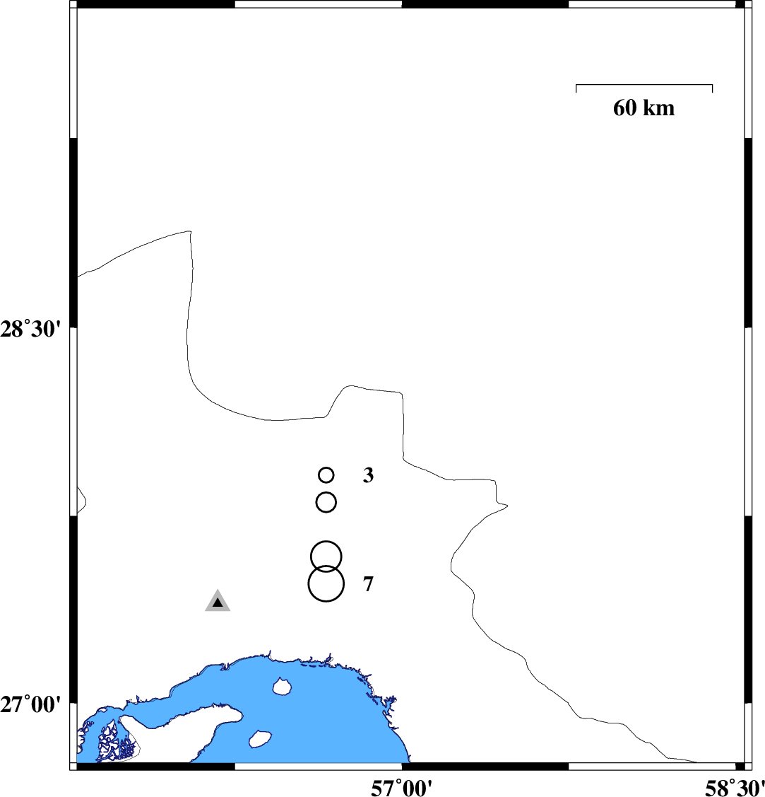 | 2011/11/12 | 13:07:05.2 | 16:37:05.2 | 28.22 | 57.07 | 14 | ML:3.2 | Kerman Province, 68 km North-West of Kahnuj | ||