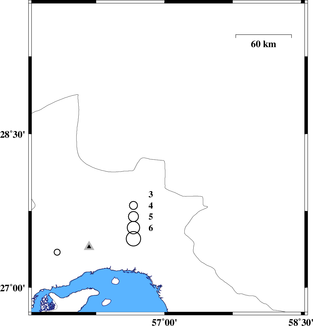 | 2011/11/13 | 14:11:06.8 | 17:41:06.8 | 28.26 | 57.04 | 14 | ML:4.4 | Kerman Province, 73 km North-West of Kahnuj | ||