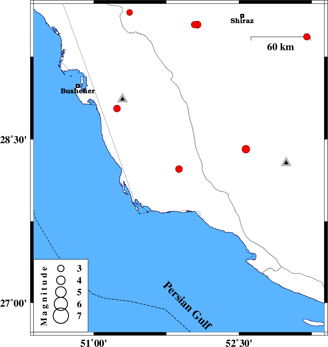 | 2011/10/19 | 05:49:01.0 | 09:19:01.0 | 28.78 | 51.24 | 10 | ML:3.2 | Bushehr Province, 11 km Ahram |